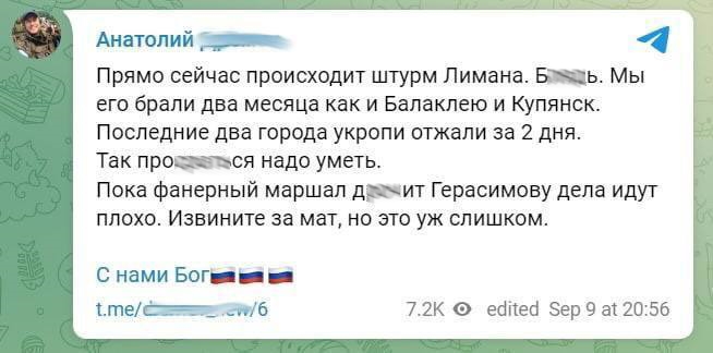 Але у російських телеграм-каналах вважають, що насправді ситуація на фронті катастрофічна. Адже окупанти брали Лиман, Балаклею, Куп'янськ аж два місяці, а втратили лише за два дні.