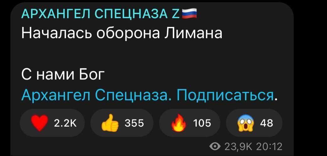 Водночас російські телеграм-канали масово повідомляють про початок боїв на підступах до Лимана. Зазначається, що імовірно ЗСУ перетнули Сіверський Донець і вирушили до сіл на околицях міста, вирішивши атакувати правий фланг Ізюмського угруповання ЗС РФ.