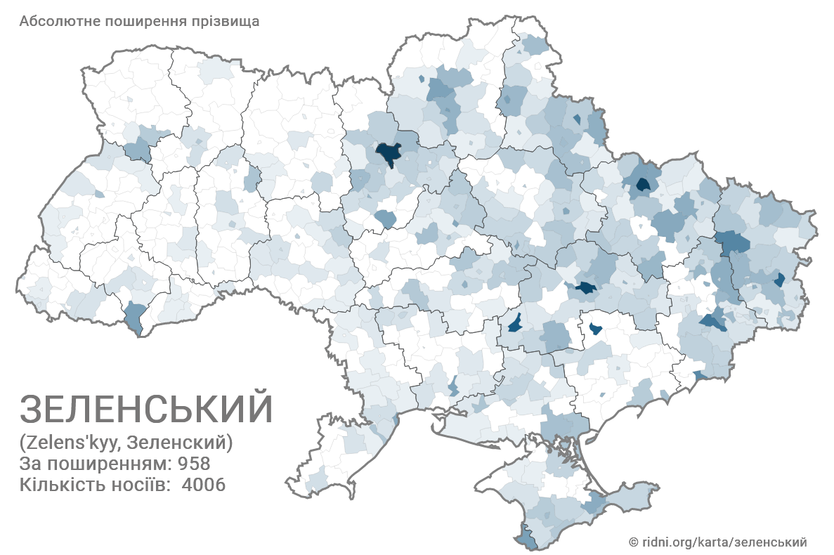 Портал Ridni створив онлайн-мапу із поширенням прізвищ в Україні, зокрема є інформація і щодо "Зеленських".