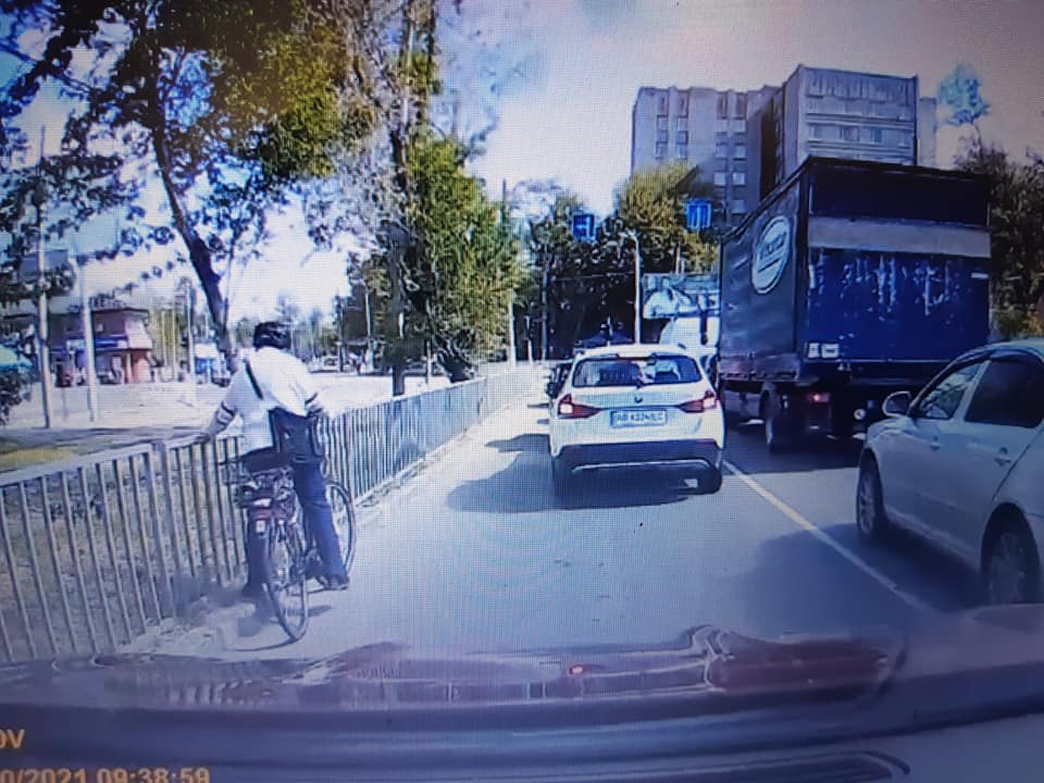 У Дніпрі на вулиці Робочій літній чоловік на велосипеді врізався в Nissan Qashqai, що зупинився на червоний сигнал світлофора, і розбив йому фару. У ситуацію втрутився випадковий свідок.