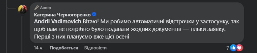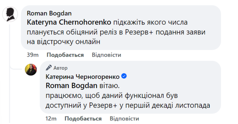 Під коментарем іншого користувача Черногоренко написала, що така опція з'явиться у "Резерв+" вже у першій декаді листопада.