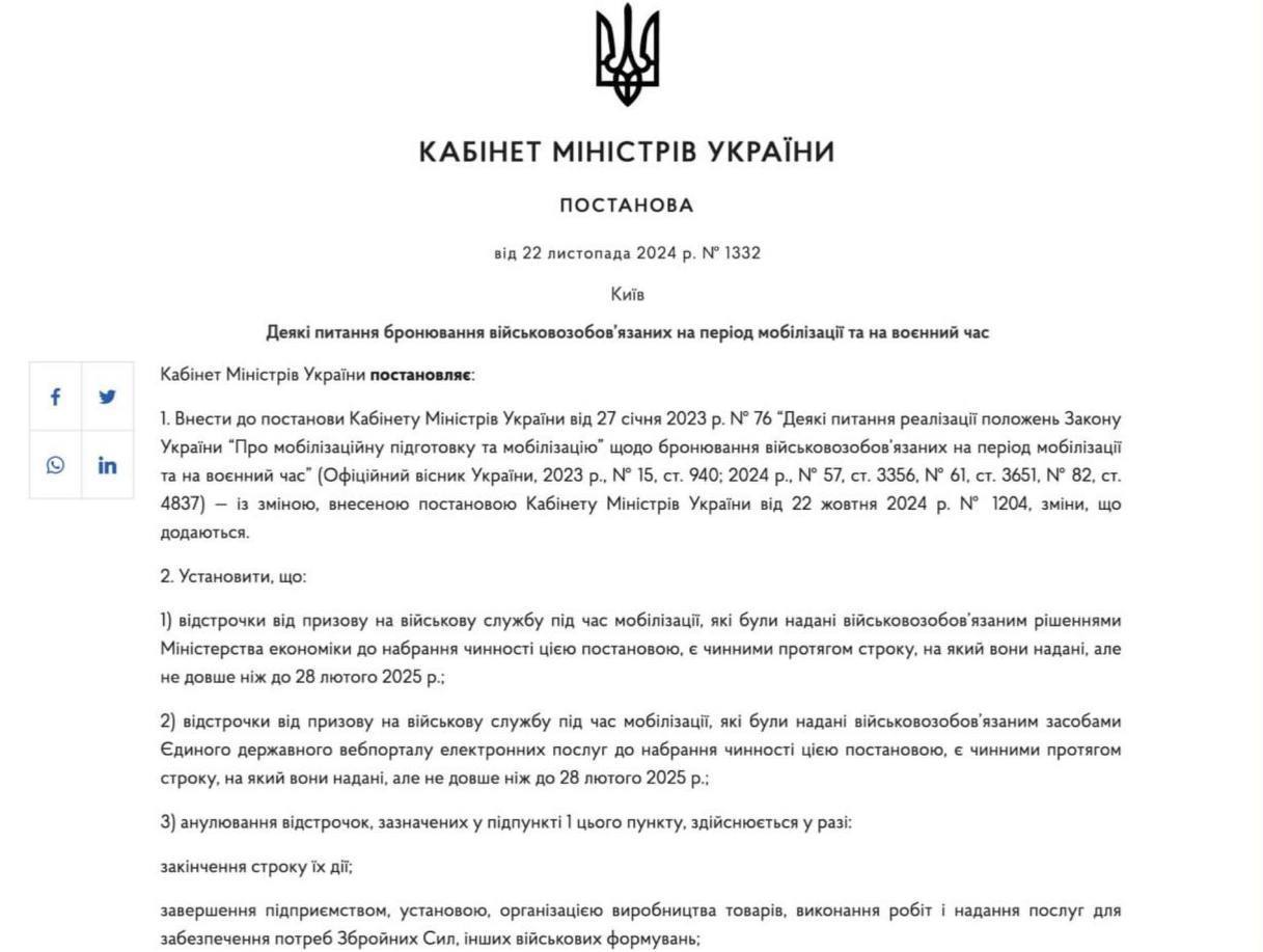 У зв'язку із запровадженням нового порядку бронювання від служби в Збройних силах України всі раніше надані відстрочки стануть недійсними з 28 лютого 2025 року.