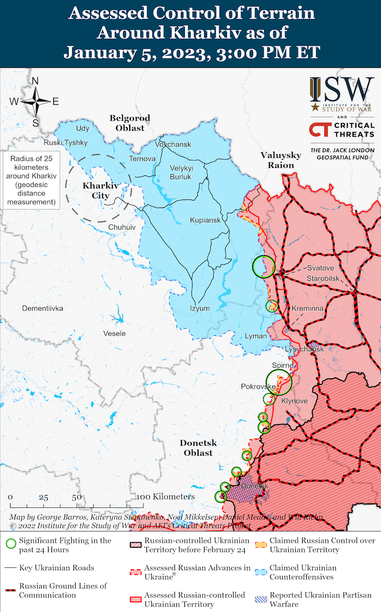 Найзапекліші бойові дії зараз біля Червонопопівки, що на 6 км на північ від Кремінної, де російські загарбники намагаються відкинути ЗСУ з позицій біля траси Р-66, однак українська артилерія здатна блокувати всі пересування російських військ трасою.