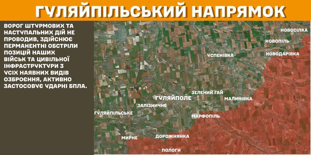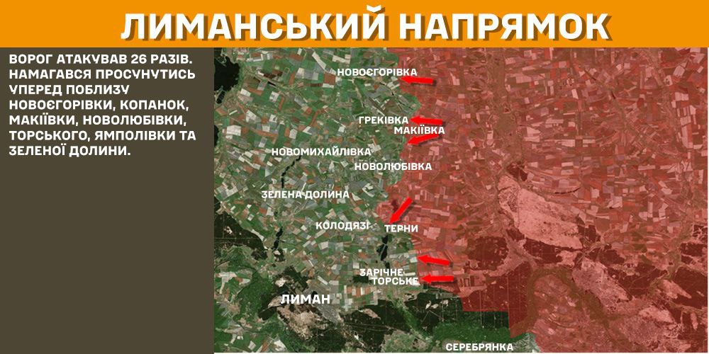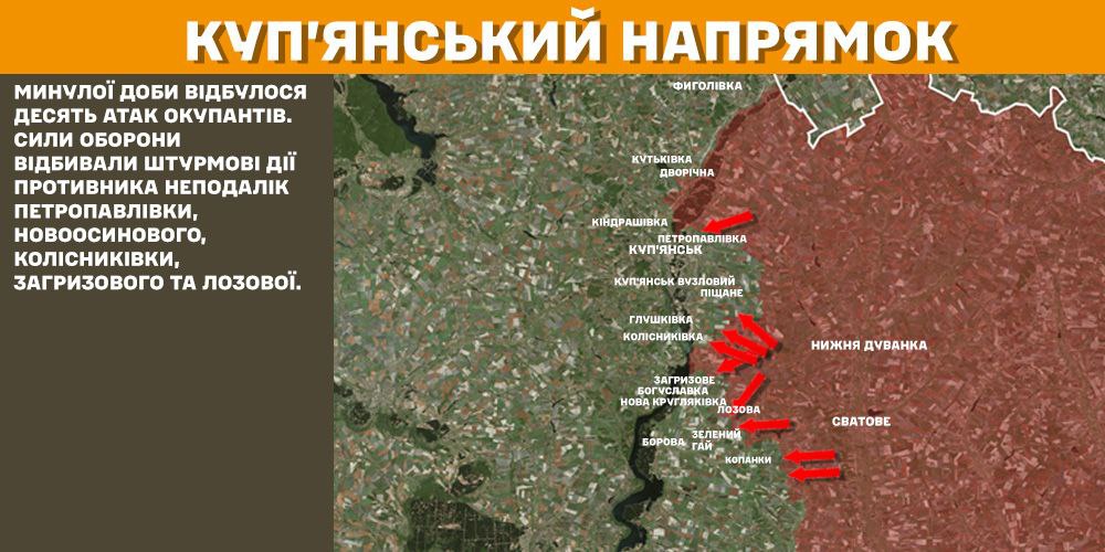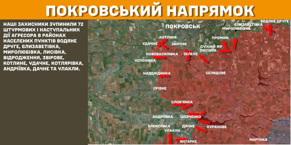 Так, згідно з оновленими даними Генерального штабу ЗСУ та карт бойових дій, на Куп"янському та Краматорському напрямках минулої доби відбулося 10 атак окупантів. На Лиманському напрямку ворог атакував 26 разів. На Торецькому напрямку ворог здійснив 15 атак неподалік населених пунктів Кримське та Торецьк. Найгарячіше було на Покровському напрямку - українські захисники зупинили 72 штурмових і наступальних дії ворога.