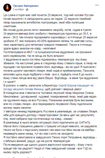 Оксана Кипоренко з Вінниці розповіла, як у міській лікарні №1 помер її чоловік Руслан. Усе почалося ще 20 вересня з кашлю. Тоді сімейна лікарка призначила антибіотик. Але вже 24 вересня ситуація погіршилася, піднялася температура до 39. А наступного дня КТ показало ураження 40-50% легень і "матове скло", характерне для хворих на коронавірус. Чоловіка перевели до реанімації, де у нього сильно заболіло серце, але до нього довго ніхто не підходив, лікарі запевняли, що інфаркту не може бути, тому що він молодий. Однак Руслан помер від інфаркту, так і не отримавши допомогу.