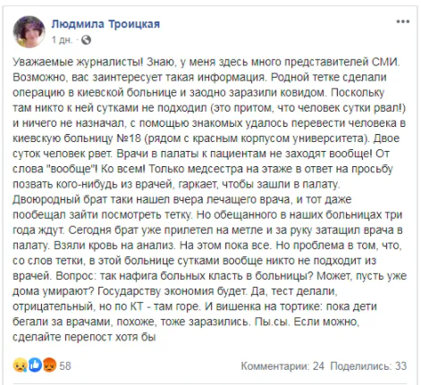 "Дві доби людину рве, в палату ніхто не заходить! Від слова взагалі! До всіх! Тільки медсестра на поверсі у відповідь на прохання покликати кого-небудь із лікарів крикне, щоб зайшли в палату. Двоюрідний брат таки знайшов лікаря і той навіть обіцяв зайти й подивитися тітку. Але обіцяного в наших лікарнях три роки чекають. Потім брат прилетів на мітлі й за руку затягнув лікаря в палату. Взяли кров на аналіз і поки все. Так, тест робили, негативний. Але щодо КТ там горе. І як вишенька на торті – поки діти бігали за лікарями, схоже, теж заразилися", – написала племінниця хворої Людмила Троїцька.