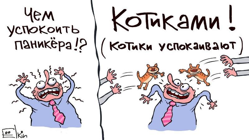 Так, художник зобразив чоловіка в офісному одязі - сорочці і краватці, який панікує, з підписом "чим заспокоїти панікера?". На наступному фрагменті малюнка йому кидають двох рудих котів і він нібито заспокоюється, а на обличчі у нього помітна посмішка.