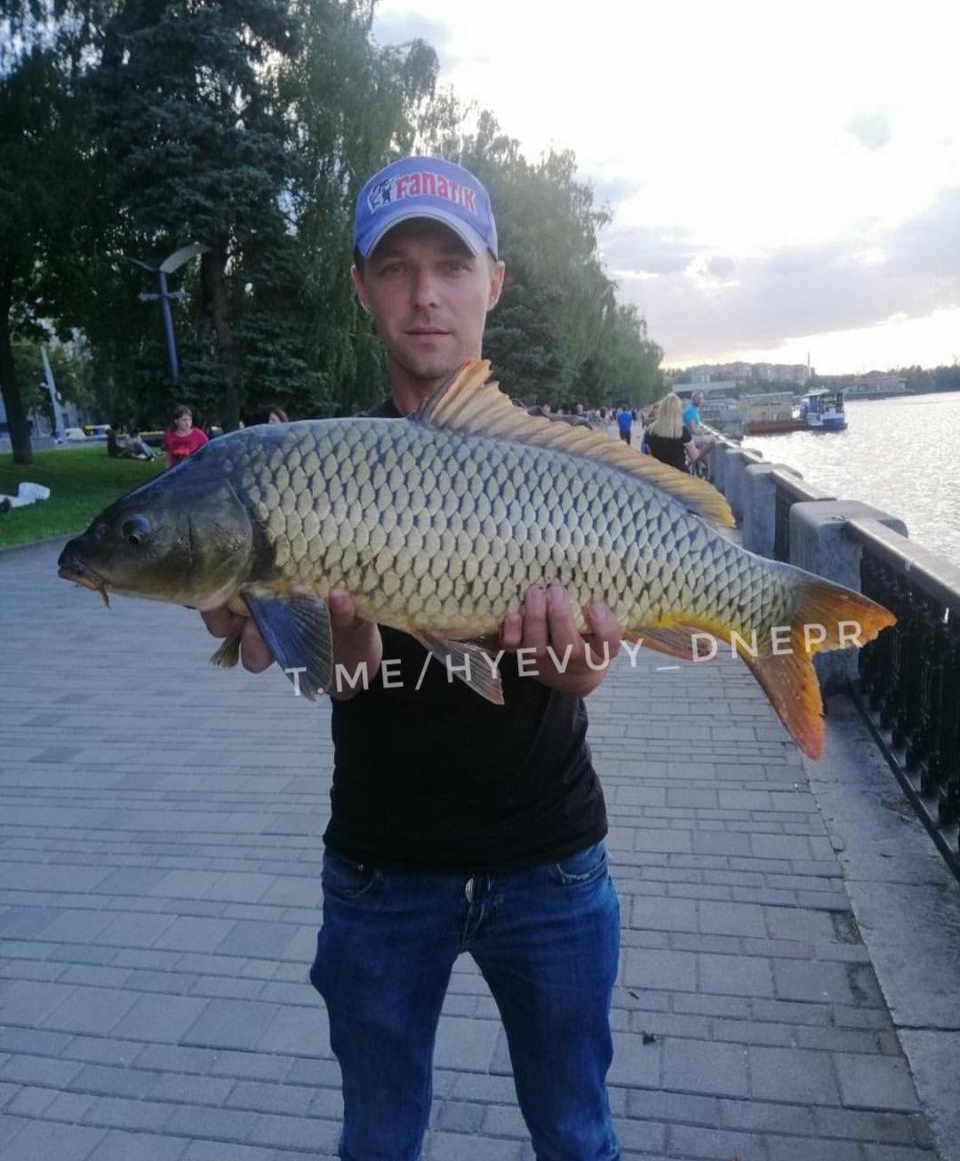 В Дніпрі рибалка з моста на набережній упіймав величезного коропа вагою більше 4 кілограмів.