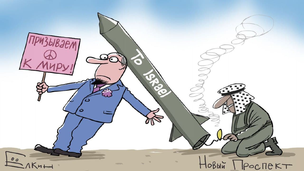 Ставлення світової спільноти до загострення ситуації на кордоні Ізраїлю і Палестинської автономії показали на новій карикатурі. Відомий карикатурист Сергій Йолкін висміяв миротворчі заяви світових лідерів.