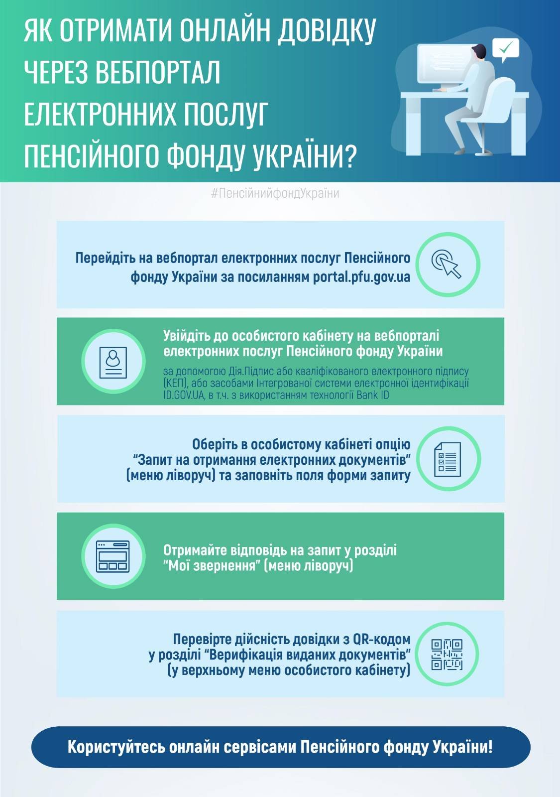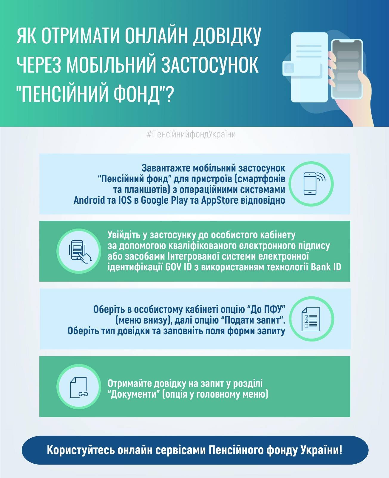 Скористатися послугою можна за допомогою мобільного додатка "Пенсійний фонд" або в особистому кабінеті на електронних послуг Пенсійного фонду України.