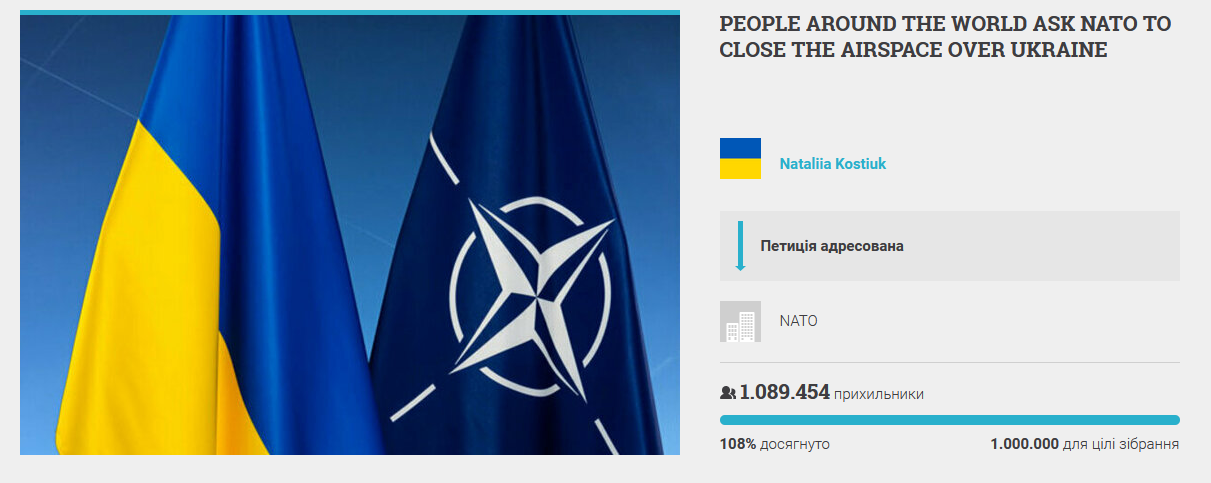 Як повідомлялося, громадяни світу зібрали мільйон підписів під петицією до НАТО про закриття авіапростору над Україною.