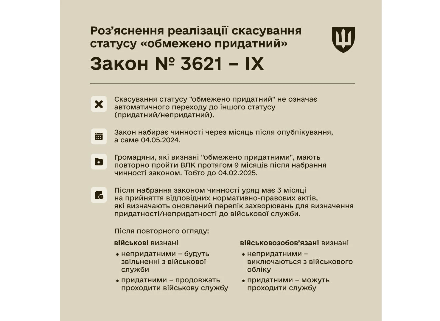 Вона зауважила, що в наказі №402 "Про військово-лікарську експертизу в Збройних Силах України" Міністерства оборони України були внесені зміни. Окрім того, що сама "придатність" буде ділитись на кілька категорій (ступені придатності до військової служби розширили), від 4 травня 2024 року (адже саме тоді набирають чинності ці зміни) статусу "обмежено придатний до військової служби" не буде.