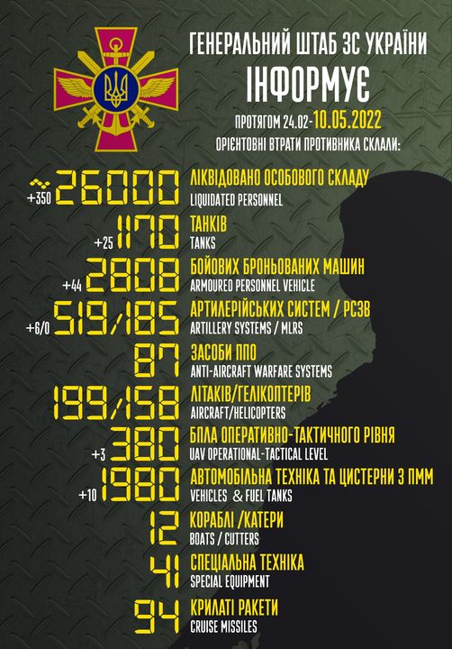 Орієнтовні втрати російського окупаційного війська станом на 10 травня: