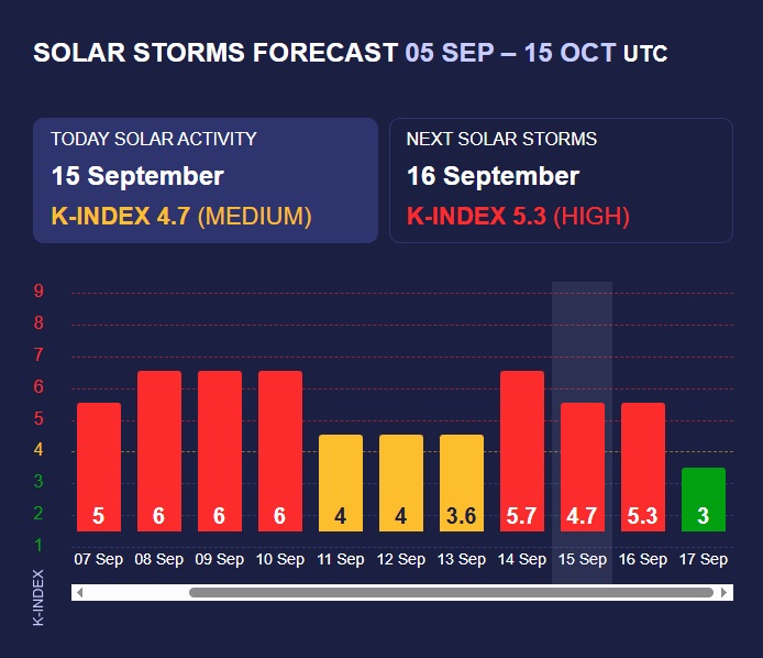 У неділю, 14 вересня, експерти зафіксували магнітну бурю з К-індексом 5,7 що є досить високим рівнем. У понеділок, 15 вересня, її інтенсивність дещо знизиться – до 4,7 бала. Однак за прогнозами фахівців 16 вересня вона знову посилиться до 5,3 бала (з 9 можливих).