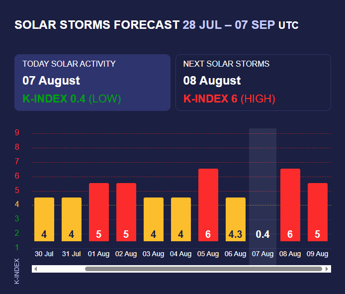 За даними експертів, сонячний шторм з К-індексом 5 ще триматиме в полоні Землю також і 9 серпня. Однак варто враховувати, що усі прогнози вчених є попередніми, оскільки сонячна активність дуже мінлива і ситуація може змінюватися навіть до декількох разів на добу.