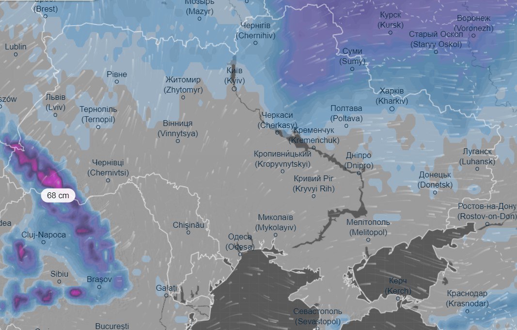 У понеділок, 25 грудня, найбільша кількість снігу впаде у західних областях України. Так, до 70 см опадів слід очікувати у Чернівецькій, Івано-Франківській та Львівській областях. Пориви вітру сягатимуть 18-26 м/с. Температура повітря у цих регіонах коливатиметься в межах 3-5 градусів тепла.