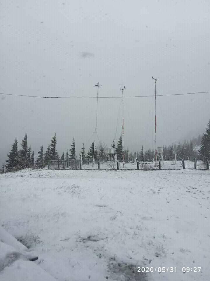 "Ранок 31 травня 2020! Як і прогнозувалося, на високогір'ї - йде мокрий сніг і дощ", - сказано в підписі до опублікованих фото засніжених гір.