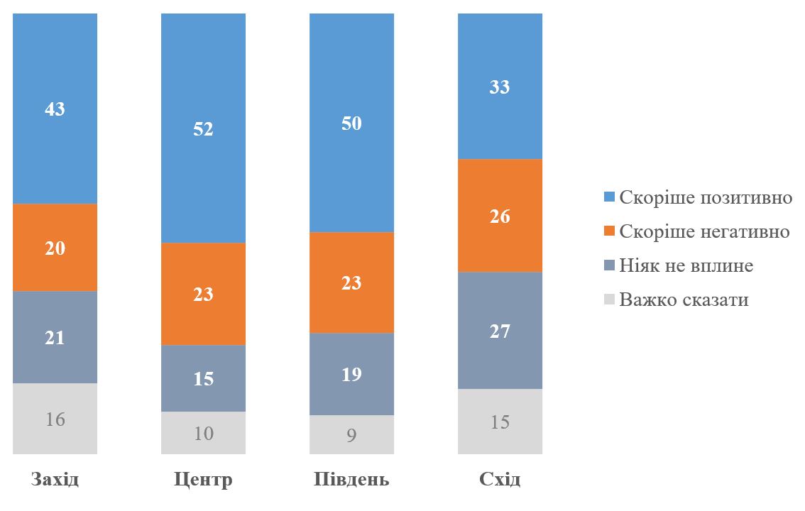 Дещо менше позитивних очікувань на Сході і на Заході країни, хоча в обох випадках частка тих, хто має саме негативні очікування, не перевищує чверті, а також баланс позитивних-негативних очікувань є позитивним.