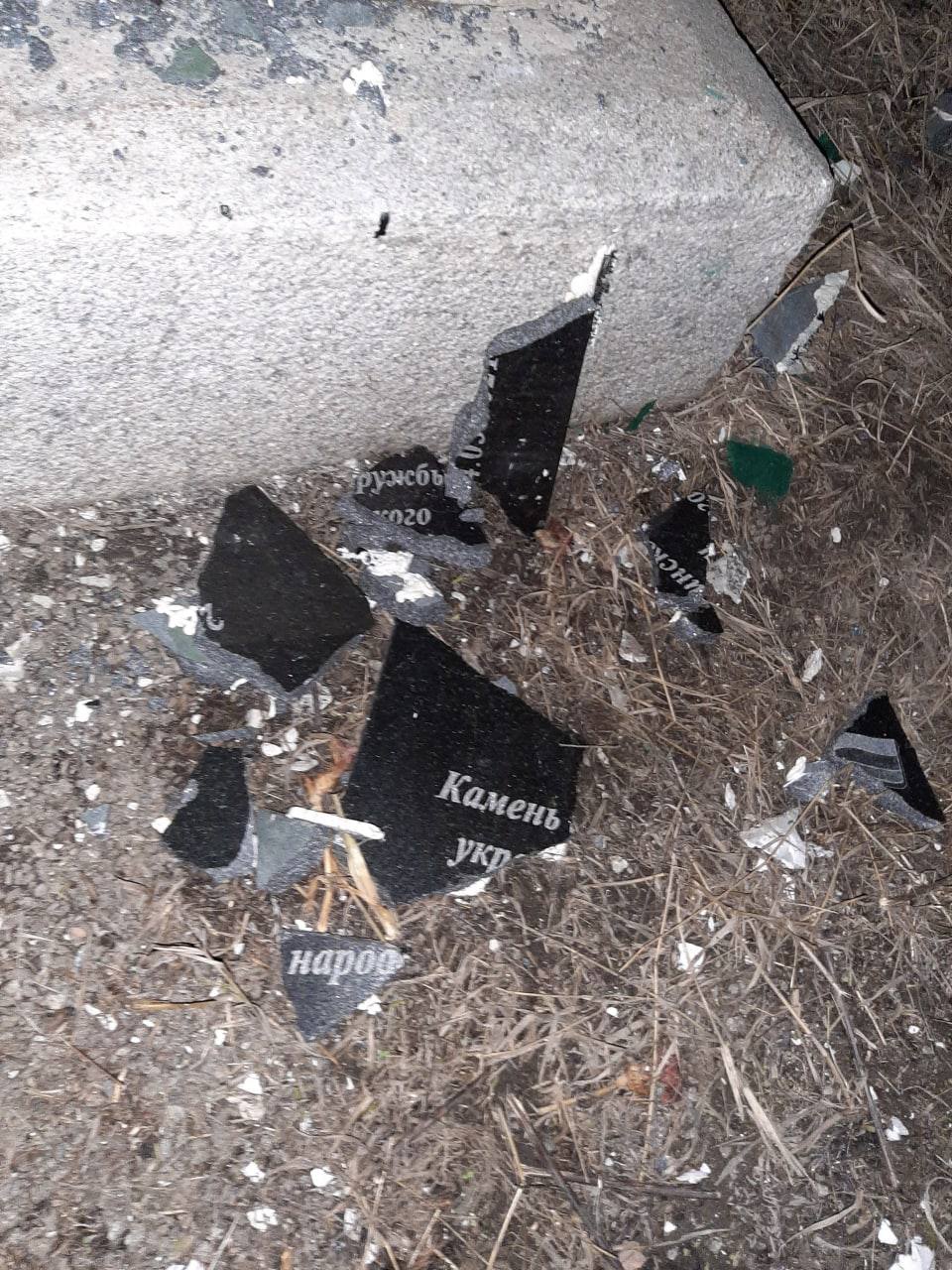 За даними Telegram-каналу "Суспільне Харків", камінь розбили представники громадської організації "Фрайкор". Це підтвердив їх лідер Георгій Тарасенко. Пам'ятник простояв лише кілька годин.