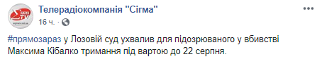 "У Лозовій суд ухвалив для підозрюваного у вбивстві Максима Кібалко тримання під вартою до 22 серпня", - йдеться у повідомленні.