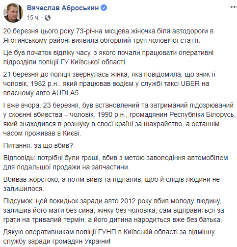 "Вбивав жорстоко, а потім вивіз та підпалив, щоб й слідів людини не залишилося. Підсумок: цей покидьок заради авто 2012 року вбив молоду людину, залишив його мати без сина, жінку без чоловіка, сам відправиться за грати на тривалий термін, а його дитина народиться вже без батька", - додав Аброськін.