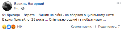 Як повідомив у Facebook адвокат Василь Нагорний, загиблого звати Вадим Гримайло, 5 років тому він ніс службу у лавах 51 ОМБр.