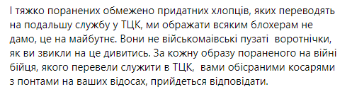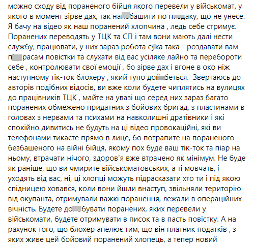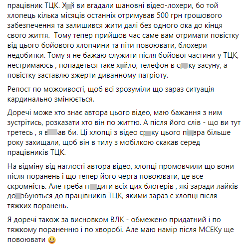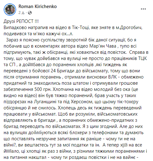 "Молода людина на відео, позбавлена одного ока, зазнала серйозних поранень, беручи участь у боях... на Луганщині та під Херсоном, чого цьому автору відео в TikTok... навіть не снилося. Цей військовий був переведений у військкомат близько тижня тому. Варто розуміти, що переведення до військкоматів відбувається з бригад, тоді як поранені і військові, які мають обмеження на службу, переводяться з бригад у військкомати", – пояснив у своєму дописі Роман Кириченко.