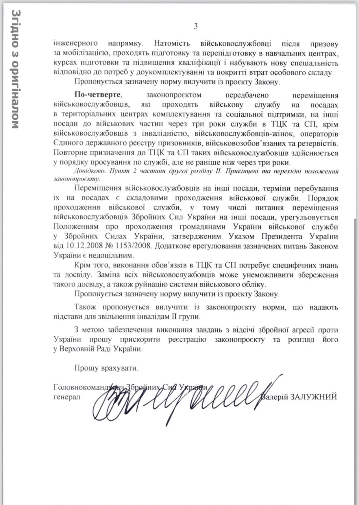 І на останок, Валерій Залужний розкритикував і норму, щодо переміщення військових, які проходять службу на посадах в територіальних центрах комплектування та соціальної підтримки, на інші посади до військових частин через три місяці служби в ТЦК. Він наголосив законотворцям на тому, що переміщення військовослужбовців на інші посади, термін перебування їх на посадах є складовими проходження військової служби порядок якої, нормується Положенням про проходження громадянами України військової служби у лавах ЗСУ, затверджений Указом президента від 10.12.2008 №1153/2008.