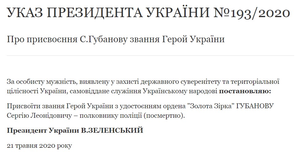 У четвер, 21 травня, президент України Володимир Зеленський присвоїв звання Героя України з удостоєнням ордена "Золота Зірка" командиру батальйону "Луганськ-1" полковнику поліції Сергію Губанову, який загинув на Донбасі.