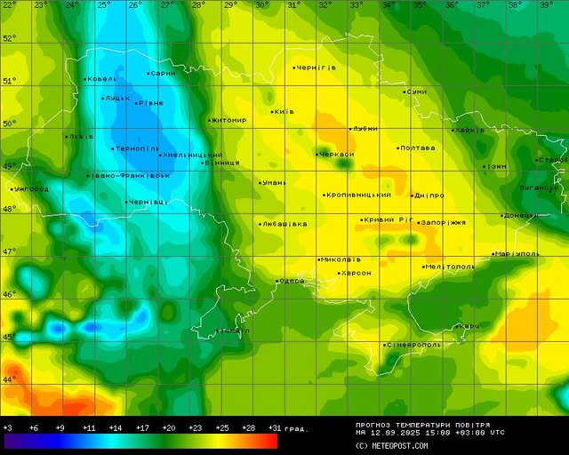 У Києві 12-го вересня дощів не очікується, проте близькість нестійкої західної вологої повітряної маси може прикрити небо хмарами. Тому й відчуття будуть більш прохолодні, ніж реальні на термометрі, очікується в столиці завтра +23 градуси", - прогнозує Діденко.