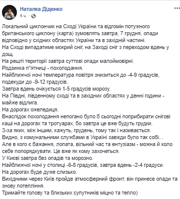 "Локальний циклончик на Сході України та відгомін потужного британського циклону (карта) зумовлять завтра, 7 грудня, опади відповідно у східних областях України та в західній частині. На Сході випадатиме мокрий сніг, на Заході сніг з переходом вдень у дощ. На решті території завтра суттєві опади малоймовірні. Родзинка п"ятниці - похолодання. Найближчої ночі температура повітря знизиться до -4-9 градусів, подекуди до -9-12 градусів. Завтра вдень очікується 1-5 градусів морозу", - попереджає метеоролог.