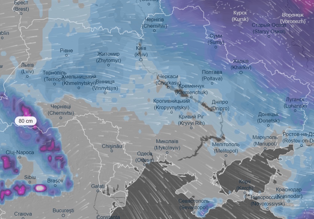 За даними радарів погоди, в Карпатах на Водохреще випаде до 80 сантиметрів снігу. Рясні опади прогнозуються і на сході України – до 20 см снігу у Сумській, Харківській, Луганській та Донецькій областях.