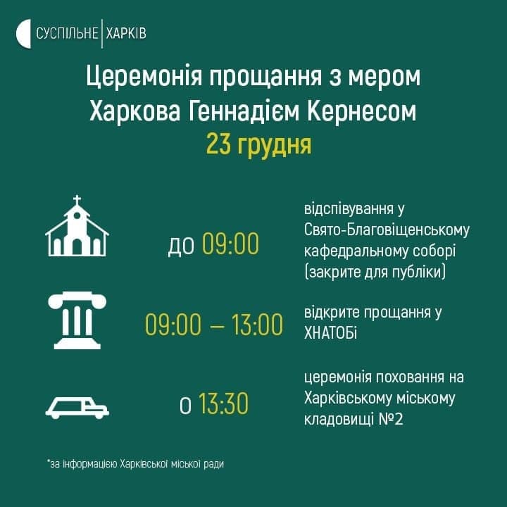 За розпорядженням Харківської міської ради в середу, 23 грудня, буде оголошено траур у зв'язку з похороном міського голови Геннадія Кернеса.