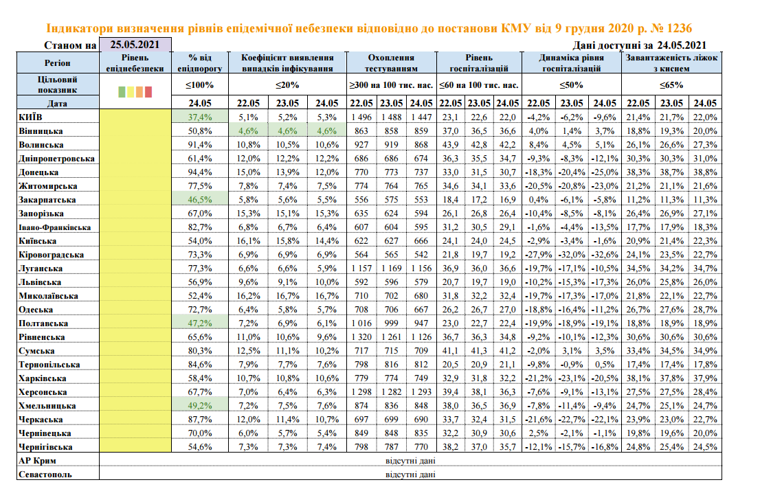 Станом на 25 травня, всі регіони України знаходяться в "жовтій" зоні.