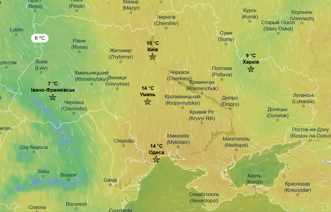 У вівторок, 31 березня, на територію України із заходу пошириться холодний атмосферний фронт із дощами та грозами, тож в західних, центральних та частині північних областей температура повітря впаде до +6...+11 °С. Тепліше буде в східних, південних областях та в центрі - до +13...+17 °С.