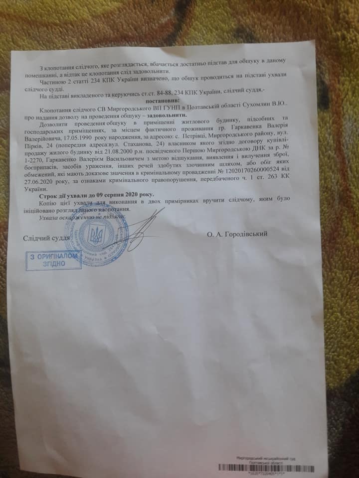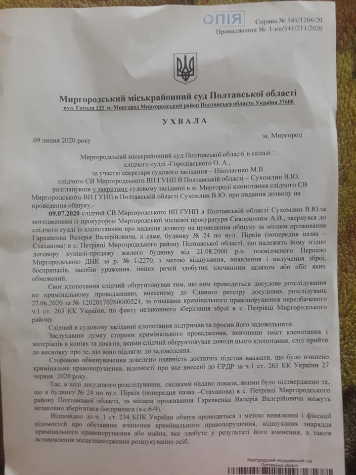 Гаркавенко оприлюднив постанову суду, на підставі якої здійснили обшук.