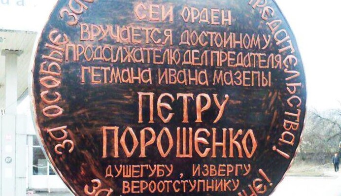 "Крінж дня. Головний непохитний наратив, якій намагаються підтримати на окупованих територіях (зокрема Донеччині) - персоніфікована відповідальність президентів України у війні. Все ставлять з ніг на голову. Дійшли до повного крінжу. Біля Оленівки (та сама, де росіяни били вперше наших військовополонених - азовців) встановили інсталяцію "Иудина-Мазепина медаль" на адресу Петра Порошенко. Що тут сказати. ДБЛ БЛД", - написав Андрющенко.