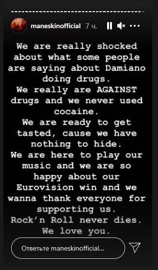"Ми дійсно вражені тим, що деякі люди говорять про те, що Даміано вживає наркотики. Ми ніколи не вживали кокаїн. Ми готові зробити тест, тому що нам нема чого приховувати. Ми тут, щоб грати нашу музику, і ми так раді нашій перемозі на "Євробаченні" і ми хочемо подякувати всім за підтримку. Рок-н-рол ніколи не помре ", - йдеться в повідомленні.