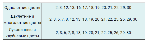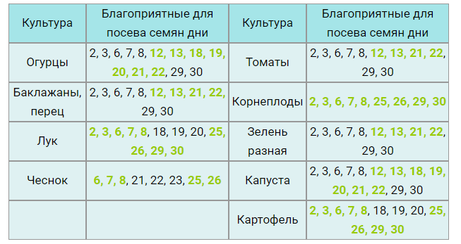 У таблиці зеленим відзначені особливо сприятливі дні для посадки.