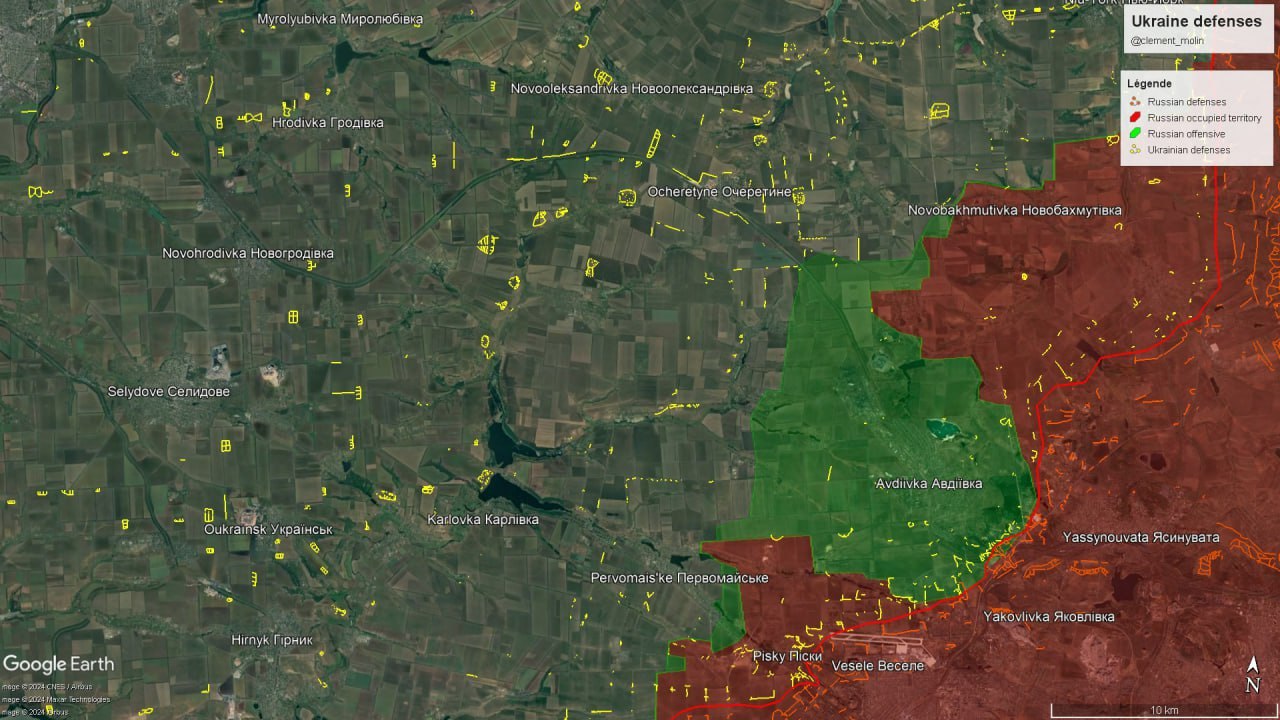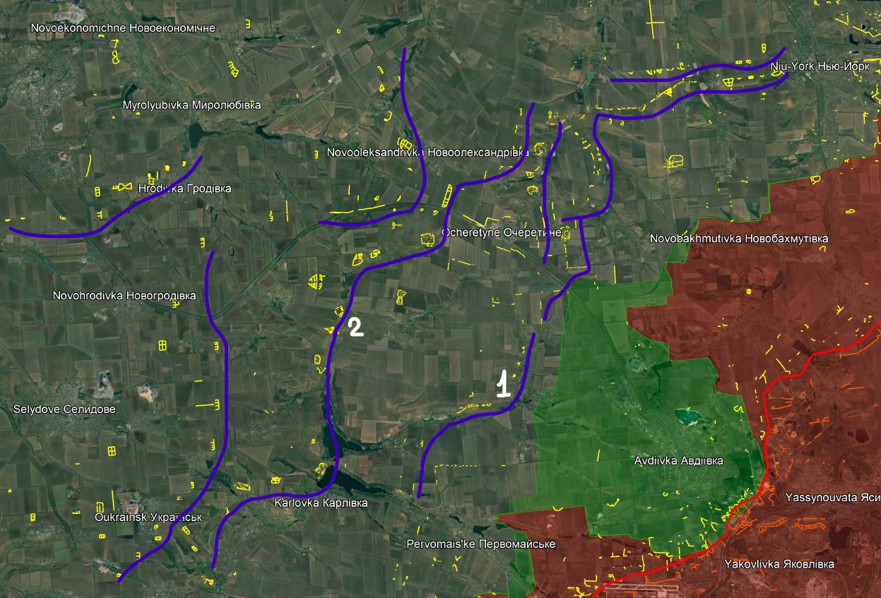 За словами аналітика, після того, як українська оборона на захід від Авдіївки впала, російська армія опинилася перед першою лінією оборони. Він зазначає, що ця лінія не оптимальна для оборони, але все-таки непогана, оскільки її підтримують озера та водойми.