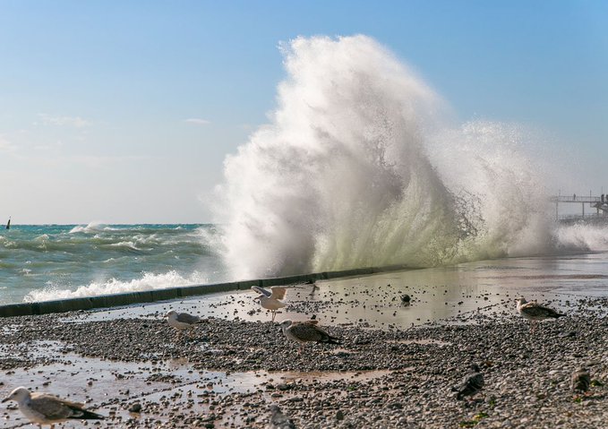 На іншій фотографії показали величезні хвилі, які розбиваються об пірс. Місце, де зроблений знімок, не вказано.