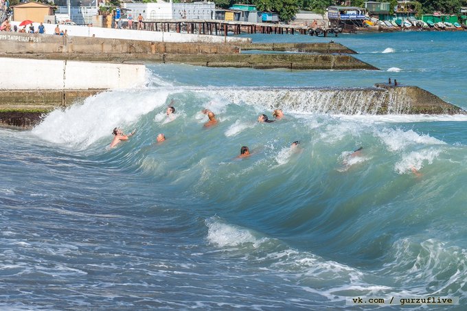 На одній з фотографій показали море в Гурзуфі. Тут люди купаються при великих хвилях.