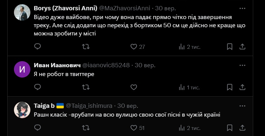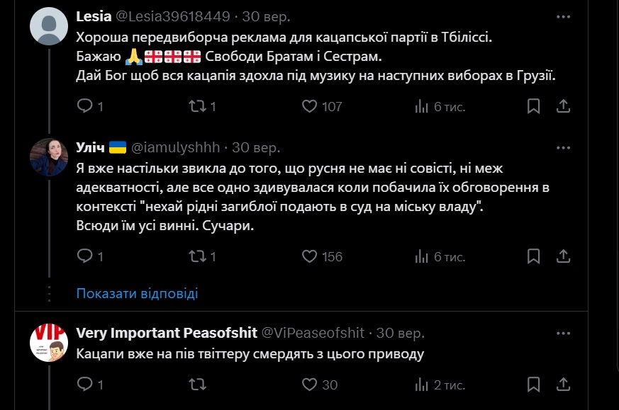 Українці в Х з ентузіазмом і злою іронією сприйняли цей випадок через загалом хамську поведінку росіян за кордоном і підтримкою ними кремлівського режиму. Проте були і стримані голоси – щодо неправильного планування в грузинському місті тощо. Також до обговорення приєдналися і росіяни, які висловили нерозуміння, чому українцям смішно.
