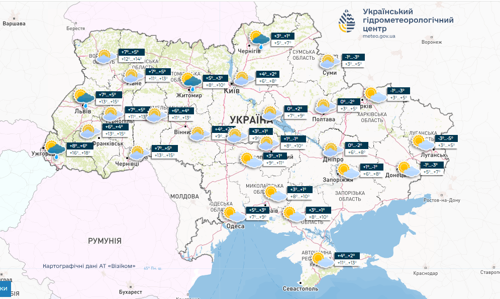 Температура повітря вдень у більшості областей +5 +10 градусів, на сході +1 +6, а на заході очікується до +16. Вночі стовпчики термометрів вночі покажуть від 0 до +5, у східних областях до -5, а у західних до +8.