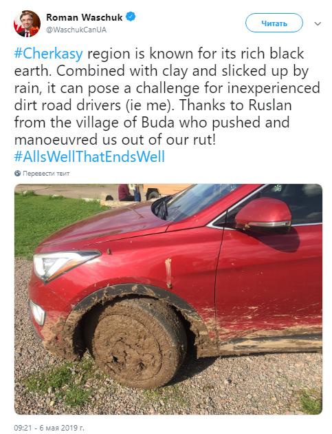 "Черкаська область відома своїм багатим чорноземом. У поєднанні з глиною і сльотою від дощу це може стати проблемою для недосвідчених водіїв на грунтових дорогах (тобто для мене). Спасибі Руслану з села Буда, який виштовхнув і вивів нас з нашої колії", - написав посол.
