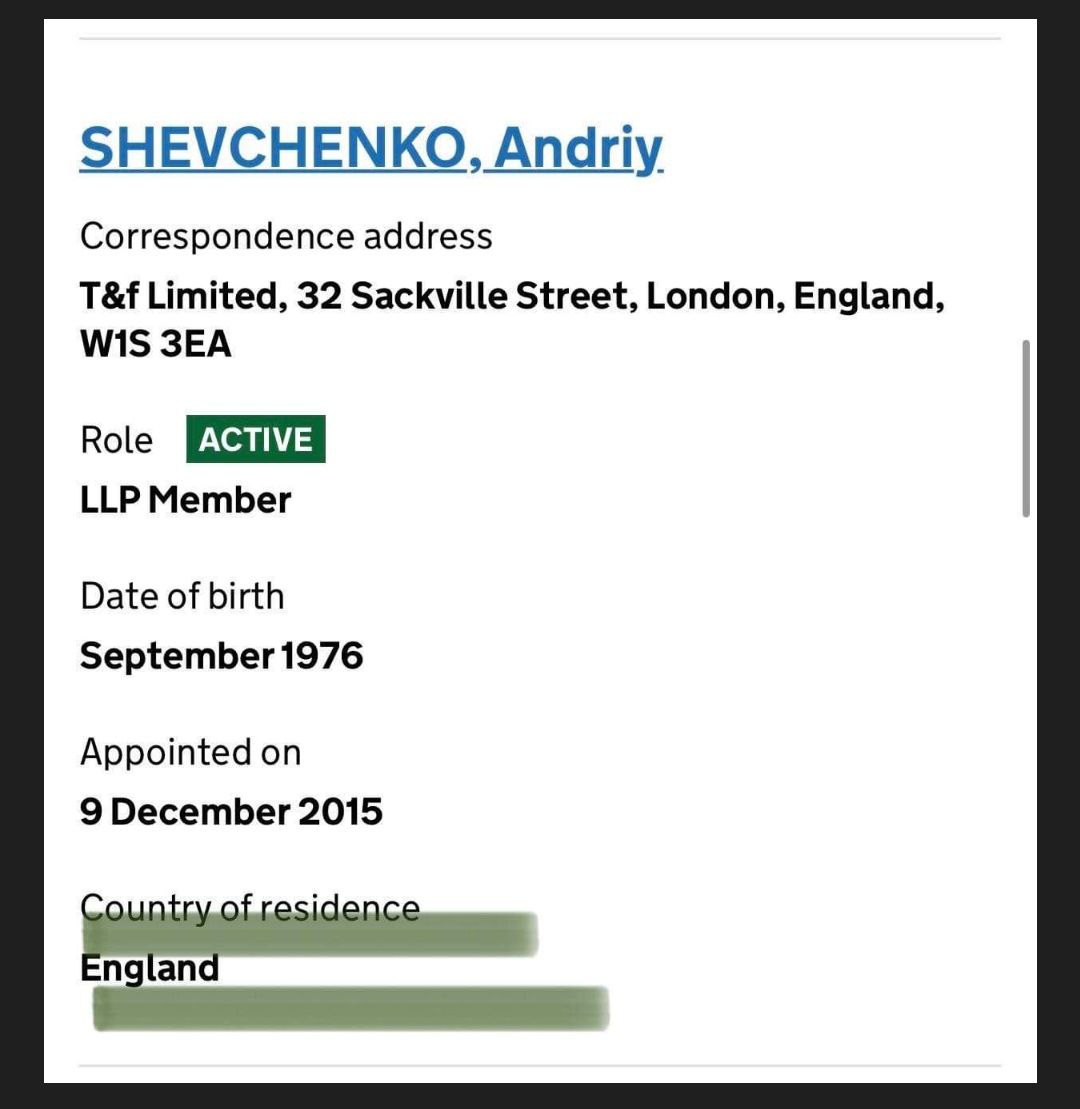 Андрій Шевченко - резидент Великобританії, і в цьому статусі він й досі входить до засновників фірми, яка має тісний зв"язок із бізнес-імперією російського олігарха Романа Абрамовіча.