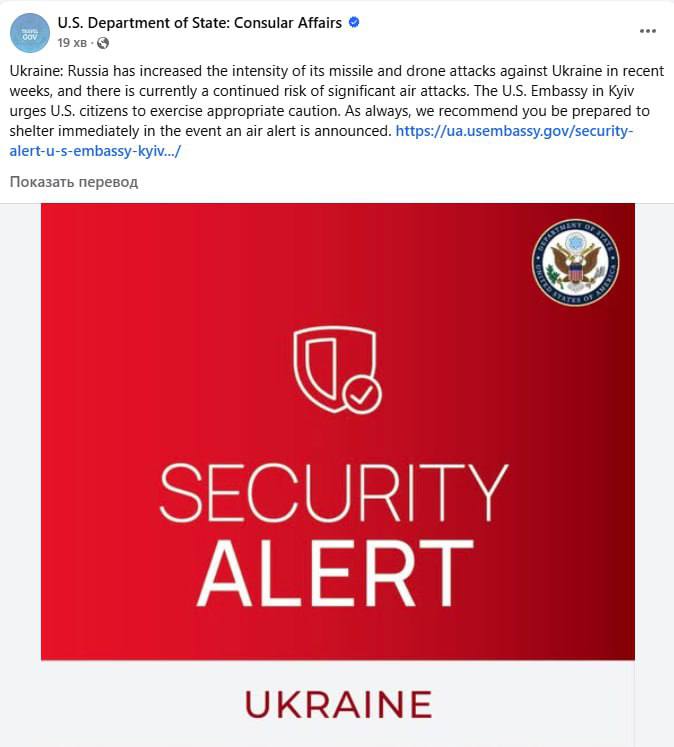"Росія протягом останніх тижнів посилила інтенсивність своїх ракетних атак та атак безпілотників проти України, і наразі існує постійний ризик значних повітряних атак. Посольство США в Києві закликає громадян США бути обережними", - йдеться у повідомленні.