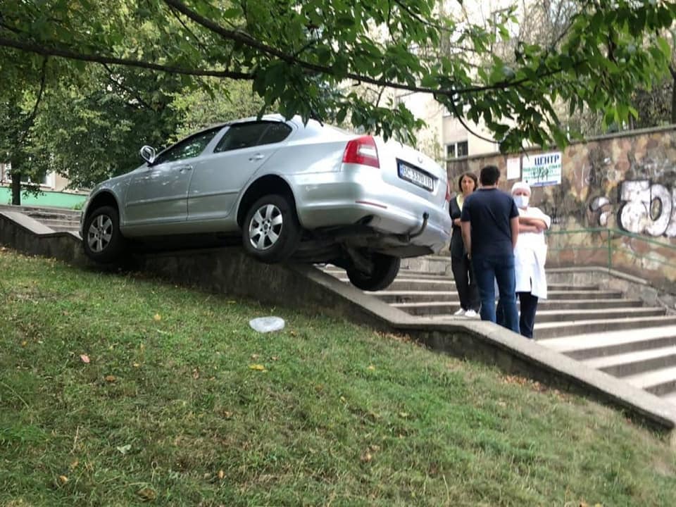 У Львові автомобіль Skoda, припаркований біля місцевої поліклініки на вулиці Мазепи, скотився по сходах і завис на бетонних перилах сходів.