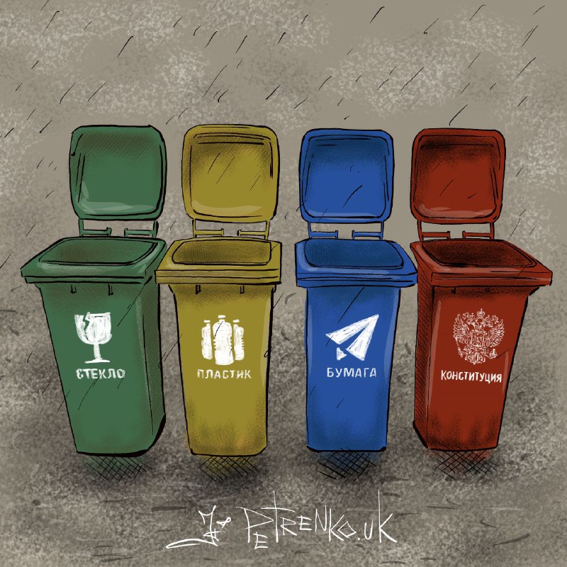 На зображенні намальовані сміттєві баки з різним призначенням: для скла пластику і паперу. Однак на останньому контейнері написано слово "Конституція" і намальований герб РФ.