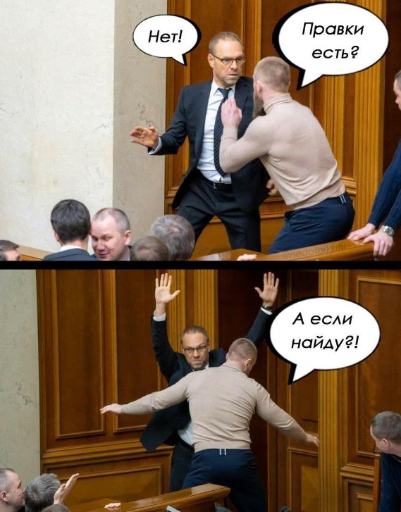 Отже, на знімку зображена боротьба депутатів Сергія Власенка з "Батьківщини" і Артема Дмитрука зі "Слуги народу". Згідно з підписаними репліками, Дмитрук вимагає у представника опозиційної політсили правки до земельної реформи, щоб прискорити голосування, а потім починає його нібито обшукувати.